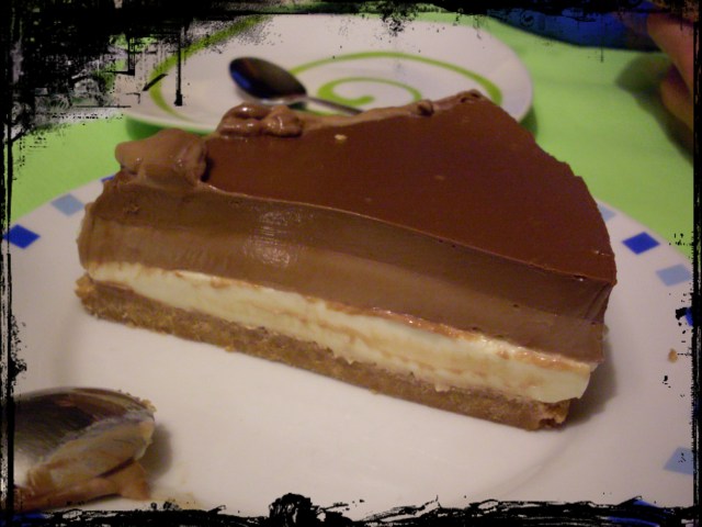 Esta tarta la descubrí hace ya algún tiempo en mundorecetas, como amante del chocolate me parecía una tarta fantastica y me moría de ganas de hacerla. Anoche tenía una cena en casa y pensé que era la ocasión ideal.