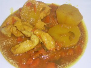 Pechugas de pollo y patatas (1 de cada por persona), 1 zanahoria, 1 pimiento verde, 2 cucharadas de sopa de cebolla de sobre, aceite, sal, 1 cucharadita de curry y ajo en polvo. 1 medida de agua y otra de brandy.