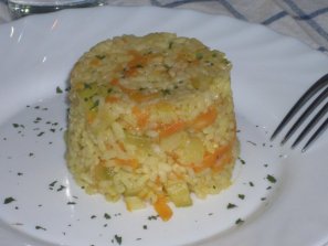 Ingredientes; arroz, curry, verduras varias (zanahoria, calabacín, pimiento, puerro…) aceite, sal y pimienta negra.