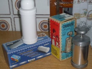 Imprescindible, una churrera. En la foto os enseño las mías. La de la derecha tiene ya un montón de años, la compró mi madre cuando se casó y es eterna, va muy bien. A la izquierda la nueva, que si os fijais en la caja vereis que viene una foto de la antigua, porque es de la misma marca. Me hizo mucha gracia que viniera con la foto de "mi churrera" y como sabía que la marca era buena, la compramos. Es del makro y creo que costó unos 8 €, es un gasto que amortizareis en seguida, mereze la pena.