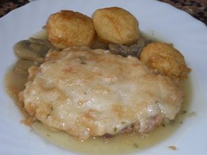 Machacamos el ajo y el perejil en el mortero, con un poco de sal. Lo ponemos en la sartén con un par de cucharadas de aceite. Sofreimos un par de minutos y agregamos el contenido de la "mitad" del sobre de crema de champiñones, le damos un par de vueltas y añadimos 2 vasos no muy grandes de agua. Lo dejamos cocer unos 15min, primero a fuego fuerte y despues reducimos, procurando remover para evitar que se pegue. Finalmente añadimos la lata de champiñones. Vertimos por encima de los cachopos y lo ponemos todo junto a cocer otros 5 min a fuego lento.