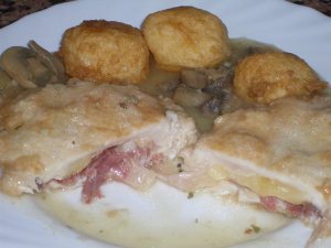 Entre dos filetes de pollo (previamente salados) colocamos el jamón, el queso y el pimiento, cerramos con ayuda de unos palillos. Rebozamos en harina y huevo y freimos. Reservamos.