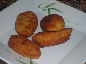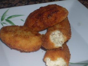 Ingredientes; 1zanca de pollo desmenuzada, aceite, 2 cucharadas de harina, poco mas de medio litro de leche, 2 dientes de ajo, sal y perejil. Huevo y pan rayado para empanarlas.