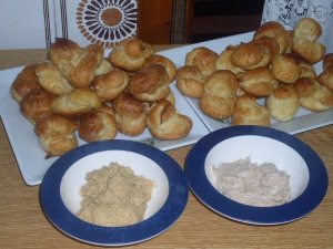 Lo cierto es que no tenía mucho humor, pero hice un esfuerzo. Preparé los profiteroles salados que ya publique el año pasado en el blog y cuya receta teneis aqui. Pero esta vez los rellené con dos riquisimos patés. La receta es bastante clasica, se hacen en muchisimas casas, pero por si hay alguien que aun no la tiene, la publico.