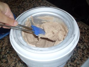Ponemos la leche con el chocolate y el ron al fuego, cuando el chocolate esté derretido, pero no esté completamente disuelto (veremos como motitas de chocolate en la leche) será el momento de retirarlo del fuego y añadir la nata liquida (la ponemos en este momento para que enfríe la preparación con mayor rapidez). Ponemos el cazo entre hielo o agua fria y cuanto esté tibio introducimos el preparado en la heladera y la hacemos funcionar.