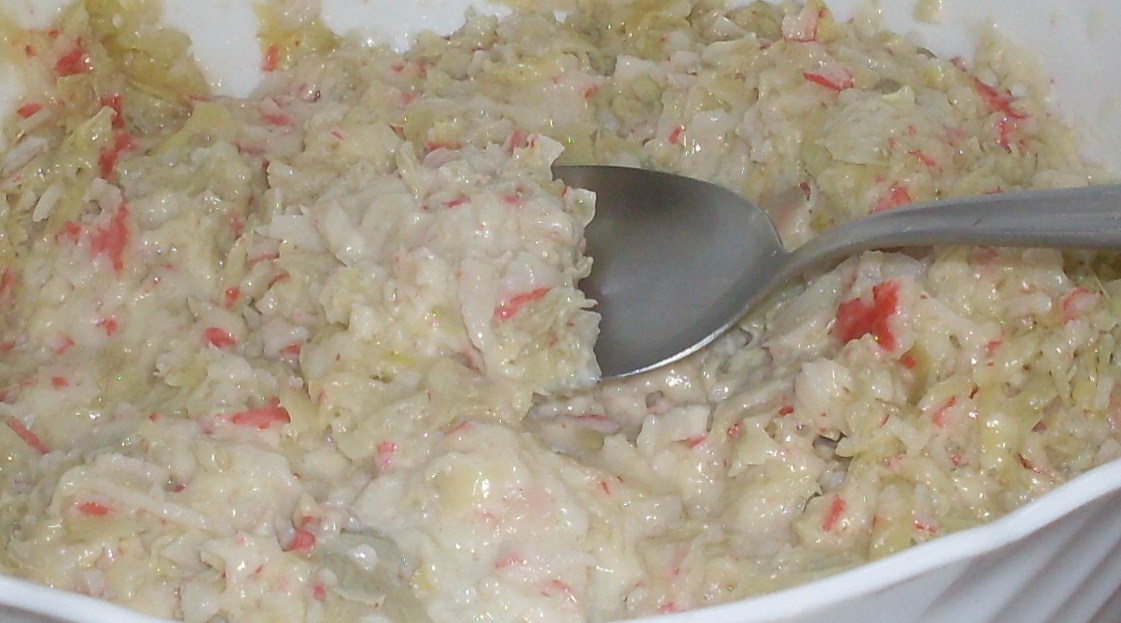 Ingredientes; 2 latas de alcachofas escurridas, 20 palitos de surimi, 100gr de queso emmental, 100gr de queso parmesano y 200 gr de mayonesa (como la vamos a calentar, la usaremos de bote)