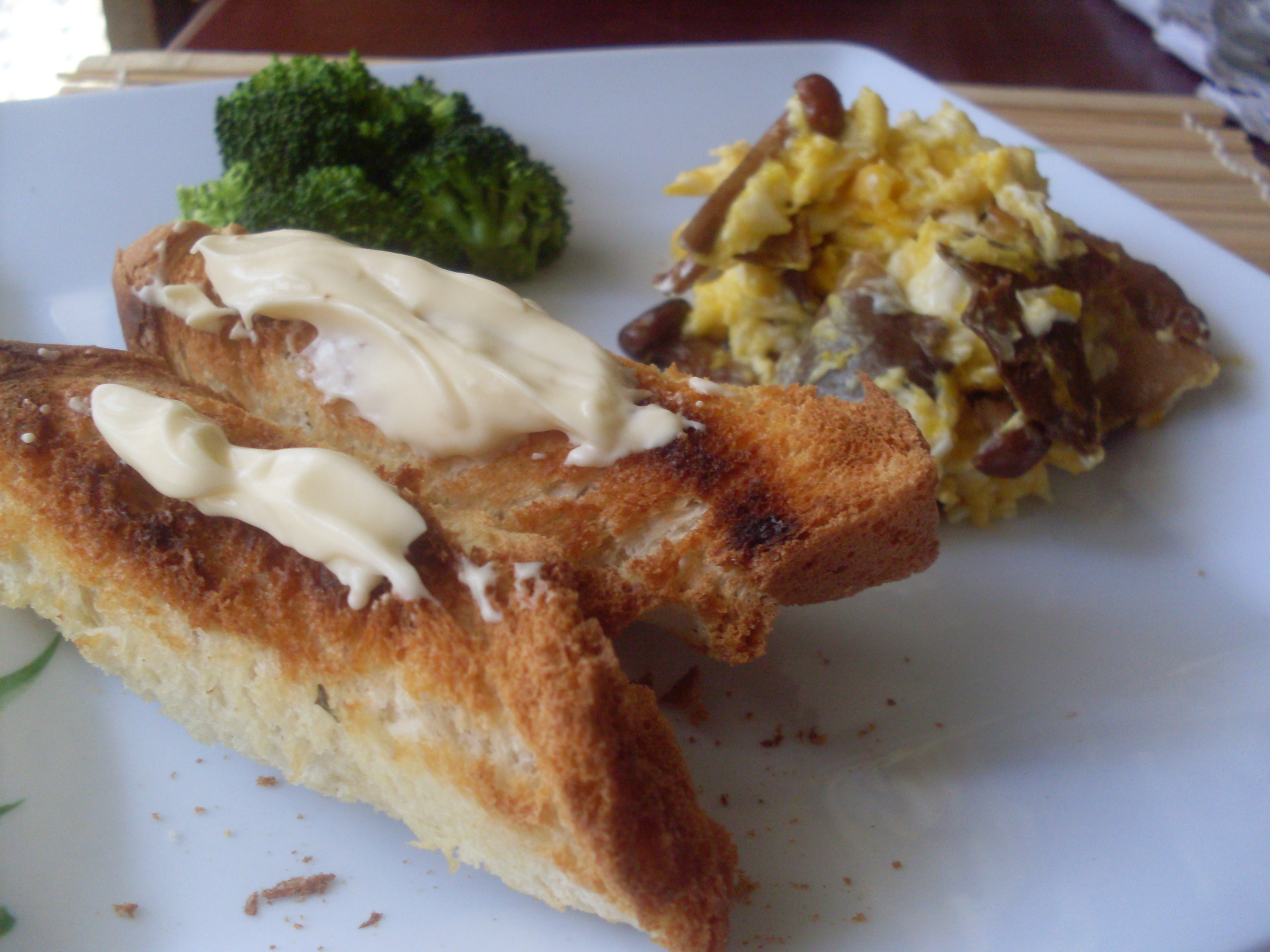 Los he acompañado con un poco de brocoli, hecho en el micro 4 min y un revuelto de setas variadas. Como salsa le he puesto mayonesa, pero le iria que ni pintada una salsa holandesa (para la próxima).