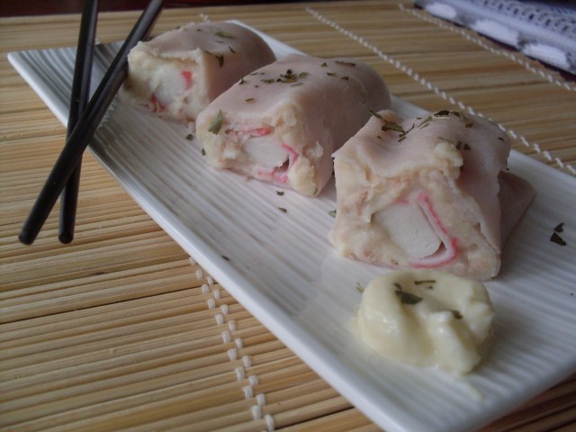 Ingredientes para 5 rollitos; 1 paquete de lonchas de pechuga de pavo, 1 sobre individual de puré de patata, 1 lata pequeña de bonito, 5 palitos de cangrejo, sal, pimienta y alioli para acompañar.
