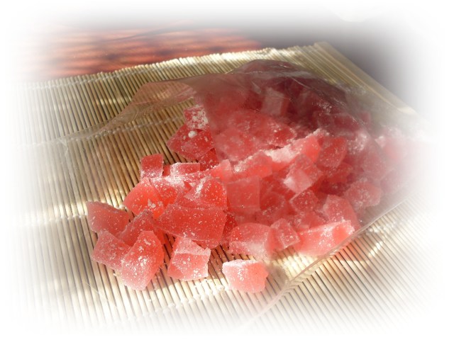 Vertimos la mezcla en moldes (mejor de silicona) pincelados con el aceite de oliva y lo dejamos reposar durante 12 horas. Después cortamos las gominolas si hemos usado un solo molde y las rebozamos en el azúcar.