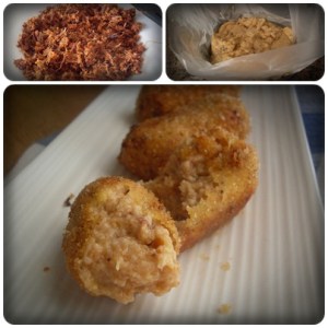 Pués bien, el otro día fuimos a cenar a un sitio estupendo que se llama «La manduca» y pedimos las croquetas de compango porque ninguno las había probado nunca. Nos encantaron, a mi sobre manera. No veia la hora de probar hacerlas en casa. Y es que tienen un sabor a compango muy muy intenso, son fantásticas.