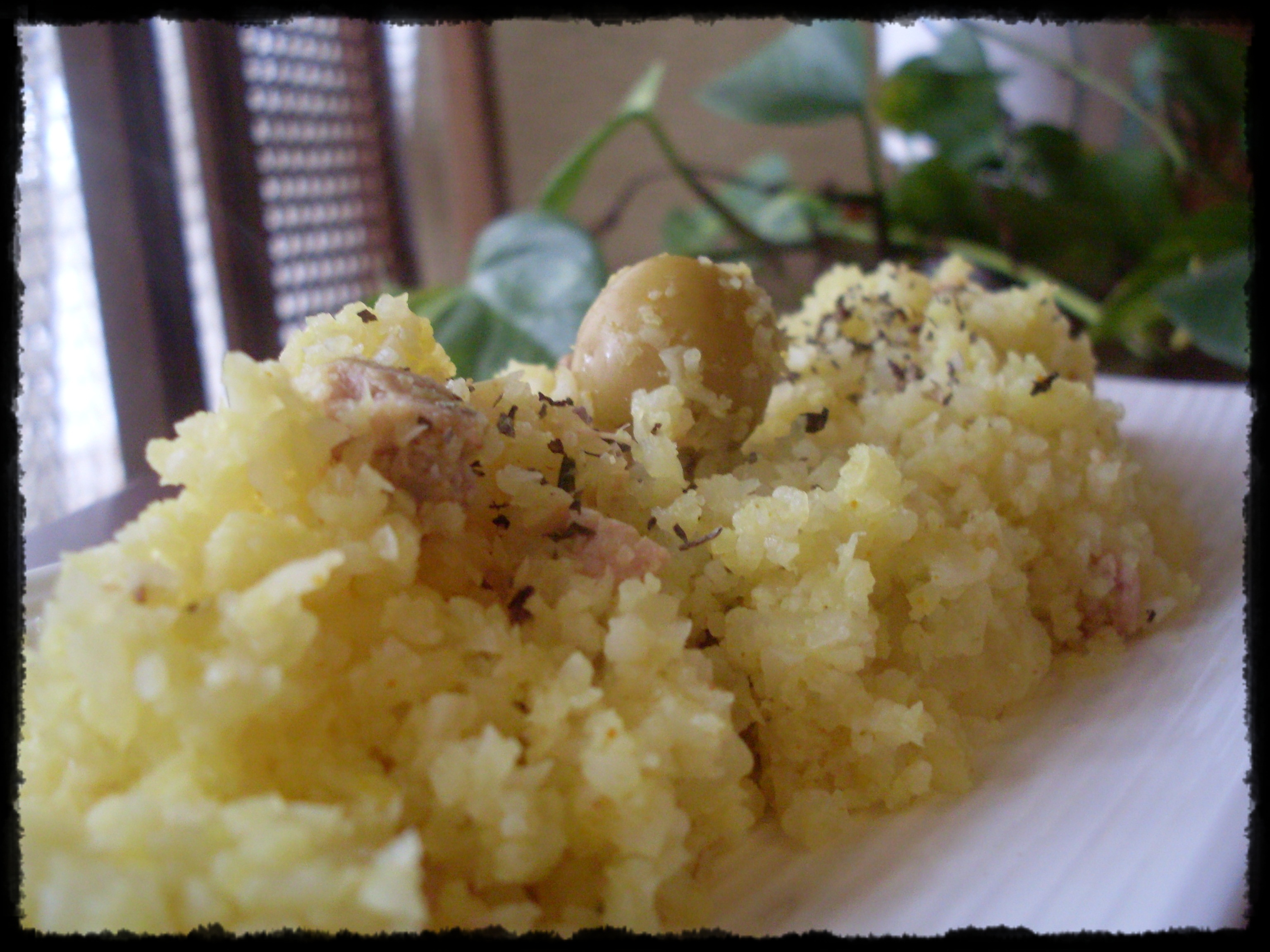 El caso es que me quede con el gusanillo y hoy he preparado un cuscús de coliflor a mi manera. Sale un cuscús de coliflor muy bueno y una vez salteado podeis comerlo como solais comer el cuscús tradicional. Yo personalmente lo como muy a menudo así, con atún y aceitunas, como una ensalada tibia, y así mismo he preparado este. También las especias las podeis variar al gusto.