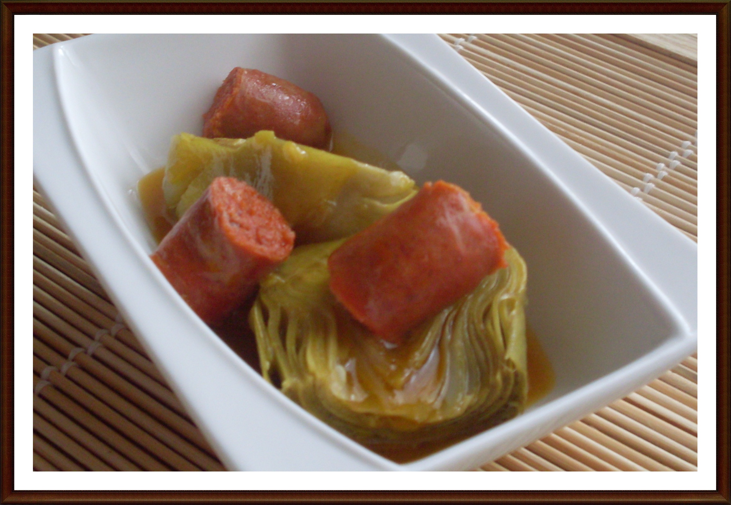 Ingredientes; 1kg de alcachofas frescas (se quedan en unos 600gr limpias), 2 dientes de ajo, 50gr de aceite de oliva, 1 cucharada de maicena, 1/2 pastilla de caldo de carne, 1 pizca de pimienta blanca, unas hebras de azafrán, 1 lata de cerveza y 5 salchichas rojas frescas.