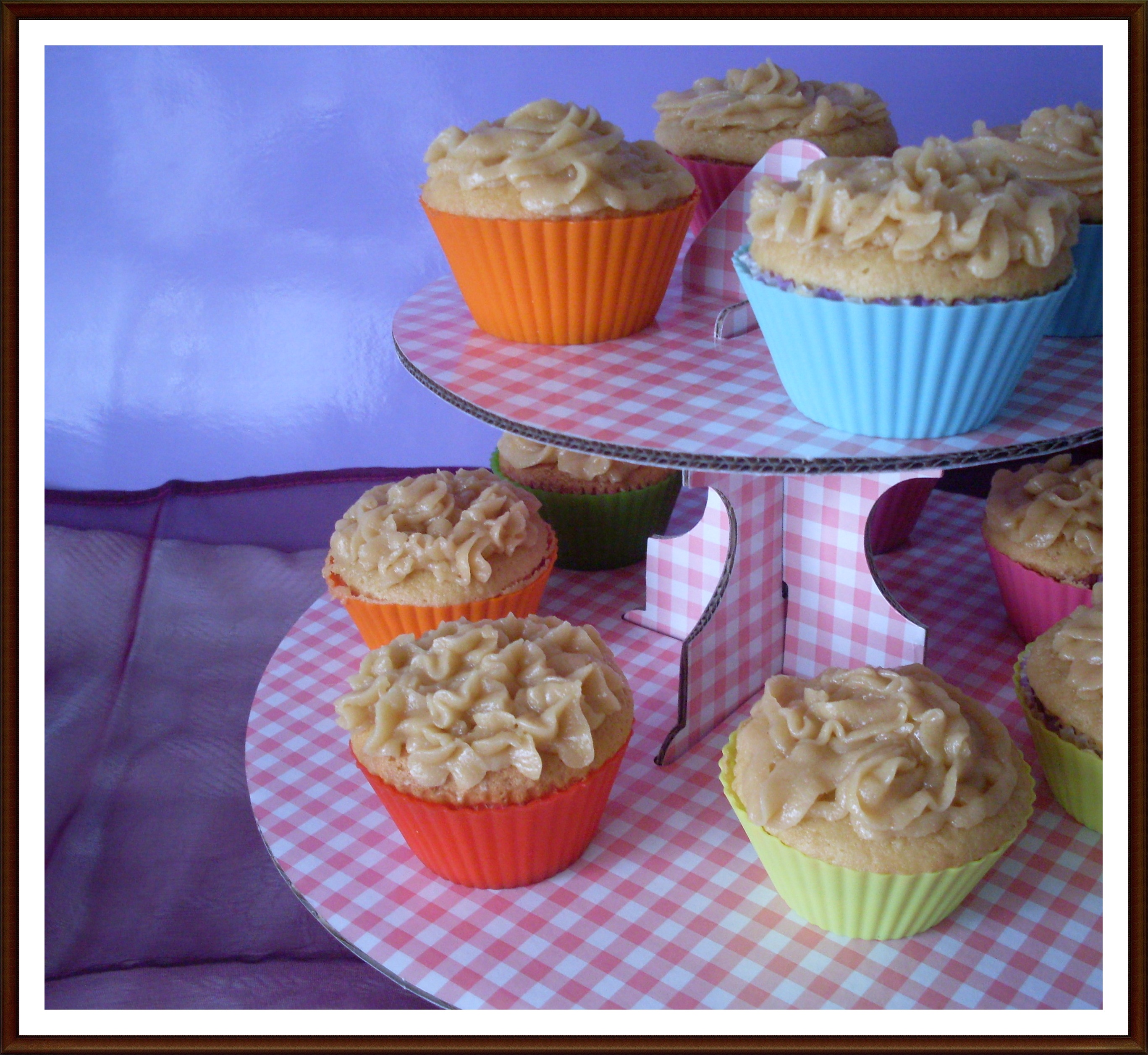 Una vez mas la decoración no me ha quedado muy fina. Mas bien está para echar a correr jajaja. Pero es que tengo que hacerme con boquillas mayores, porque tengo a montones, pero todas pequeñitas, que no son tan utiles para estos casos y hoy en concreto me encontré con que el frostings recién hecho no cogia forma y una vez frío no salia por la boquilla, así que tuve que volver a dejarlo templado para poder usarlo y así no aguantó la forma ;(. Bueno, no os dejeis engañar por su aspecto cutrillo, están increiblemente buenos 😉
