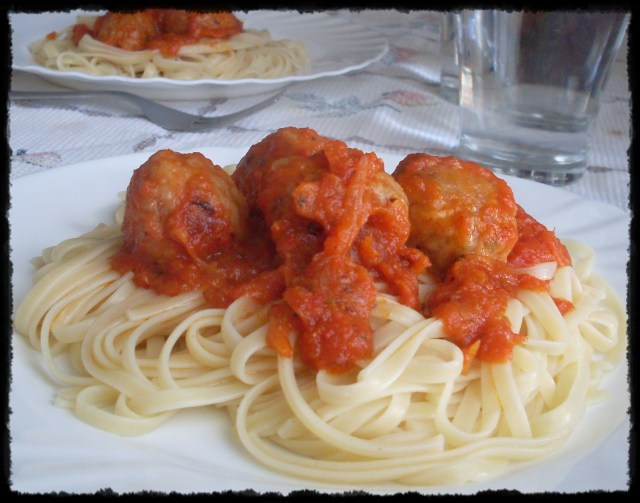 Desde que de niña vi la dama y el vagabundo, siempre quise comerme un buen plato de espaguettis con albóndigas 😉 y no se porque pero aquí no hay mucha costumbre de comerlo así. Hoy lo he preparado en casa, eso si con tallarines, que era lo que tenía a mano y ha quedado un plato riquísimo.