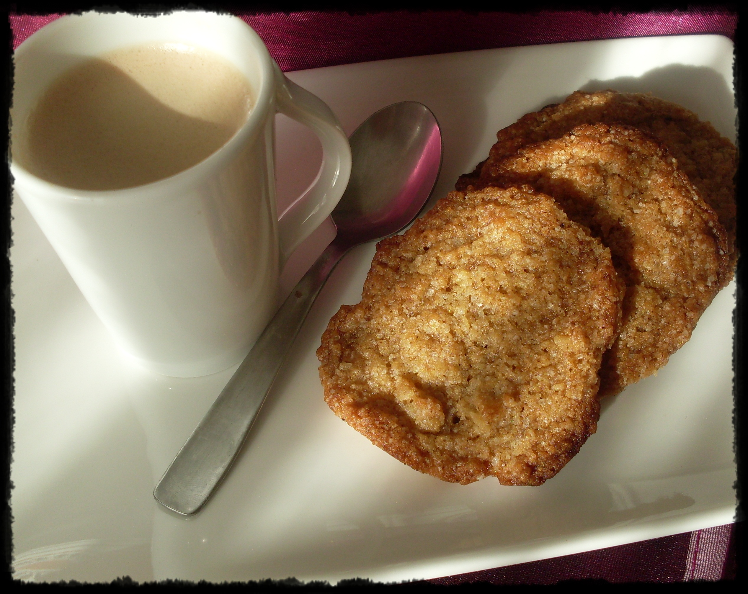 Salen unas galletas extra crujientes, bastante finitas, porque aunque pongas pegotes, la masa se desparrama en el horno, y con una mezcla de especias muy equilibrada, de manera que ninguna de ellas sobresale por encima de las demás y aunque todas le dan su toque, las galletas tienen ese toque, pero no se nota que lleva tanta varidad. Además con el azúcar moreno, saben como a caramelo. Vamos, a mi me han gustado muchísimo.