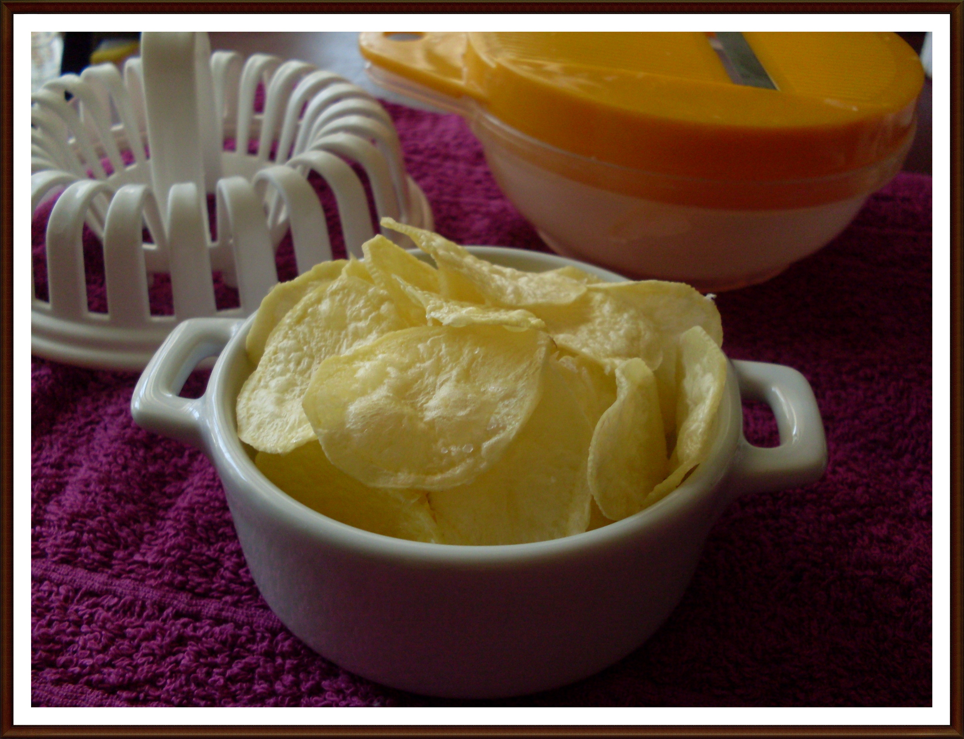 El proceso es tan sencillo como pelar la patata, cortarla con la mandolina, sazonarla y colocarla en el aparato que llevaremos al microondas. Cuanto tiempo??? dependerá de la potencia. En la feria lo tenian 3 min en un micro de 1000w, pero el mio tiene un montón de años w menos, así que las pongo 6 min (las de la foto son las primeras que hice y se hicieron en 5, pero si las dejo un minuto mas, doran un poquito).