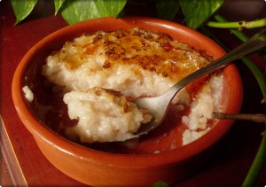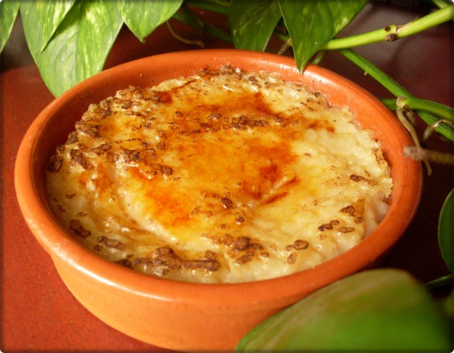 Y lo segundo es que por aquí, siempre se sirve «requemado», porque el arroz con leche está frío y cuando lo requemas y lo sirves al instante, el contraste de temperaturas hace que el sabor sea incluso mejor. Por este motivo tambien, se suele servir en recipientes poco profundos, para que el calor del quemador llegue a todo el arroz.