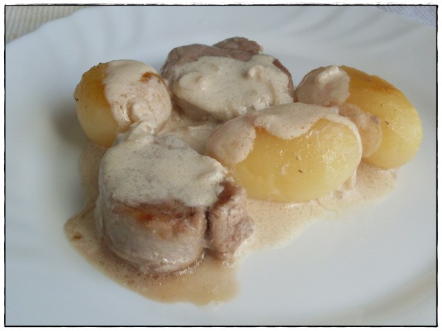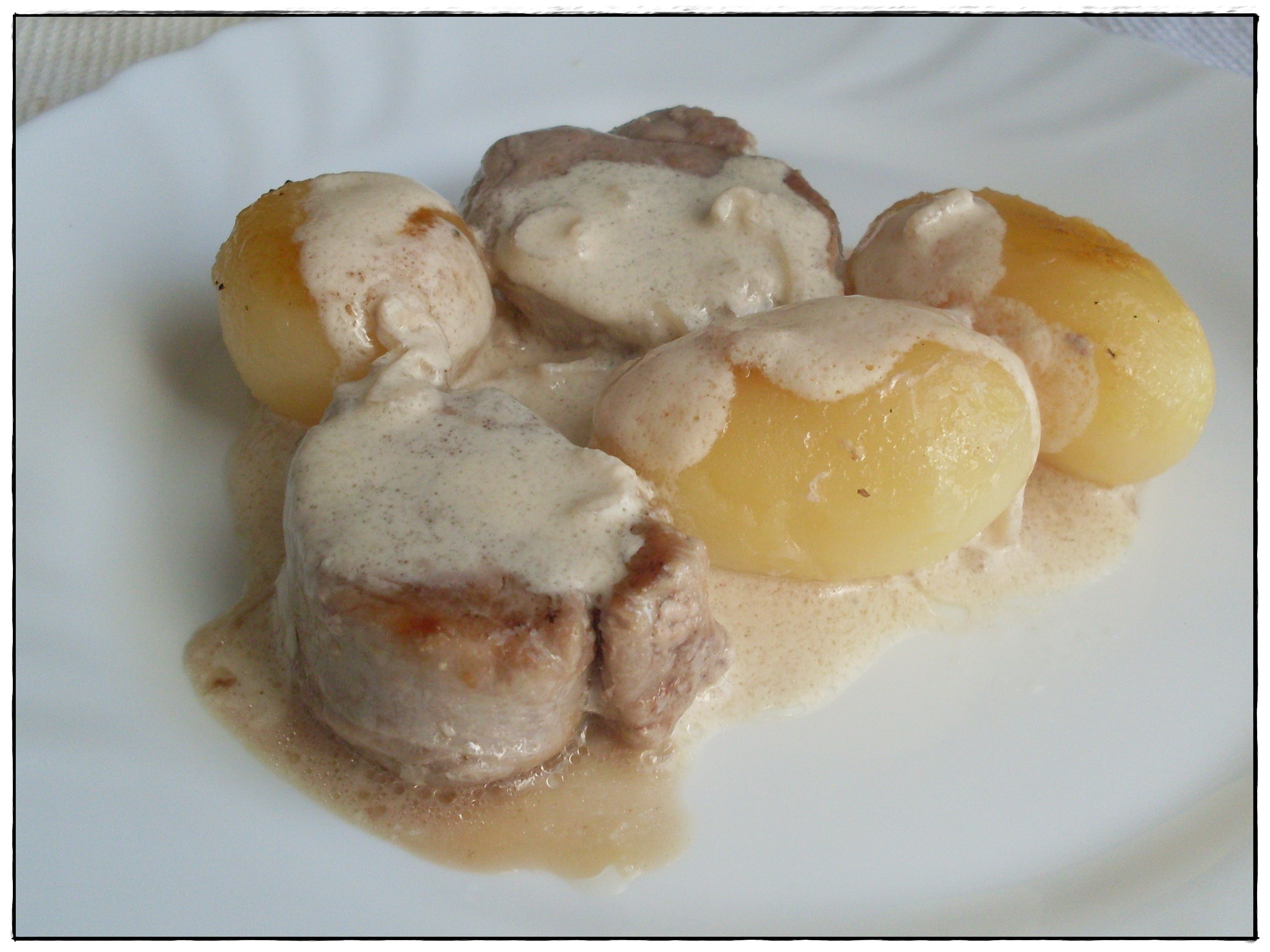 Ingredientes para 2 personas; 1 solomillo de cerdo, 1/2 bote de patatitas ya cocidas, 200ml de nata liquida, 1 chalota, 1 copa de coñac, sal y pimienta.