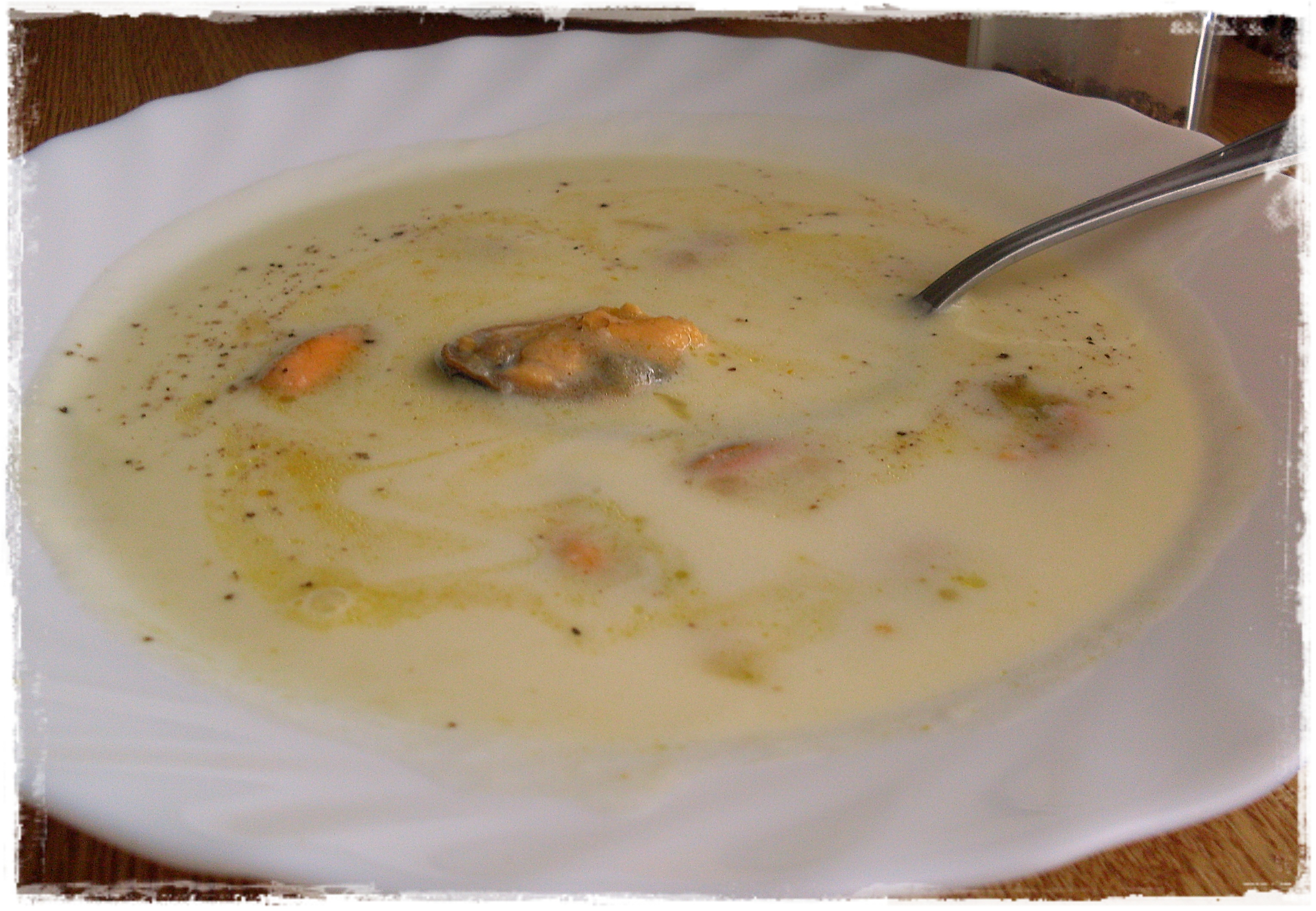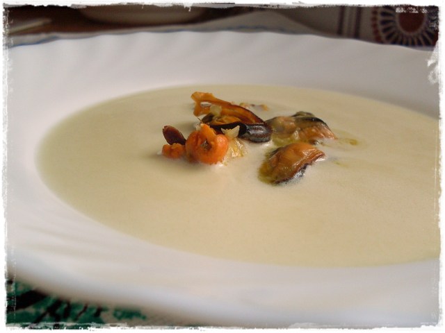 Esta crema venía en la revista thermomix de hace unos meses y la verdad es que me la apunté en pendientes, pero luego me olvidé completamente de ella. Finalmente ha caido este fin de semana y tengo que decir que me ha gustado muchísimo. Es muy líquida para ser una crema, mas bien lo llamaría sopa, pero el sabor es magnifico, el ajo le da un toque muy suave y luego ya cuando mezclas con los mejillones…. fantástica.