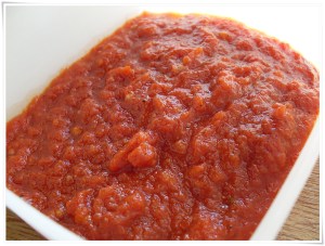 Ingredientes para la salsa de tomate picante; 400gr de tomate triturado, aceite, ajo, 2 chiles, pimenton dulce, vinagre y sal.