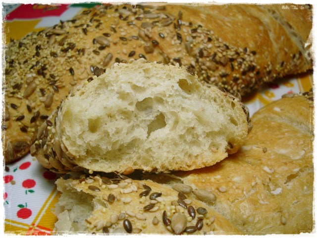 El pan está bueno a pesar de su sencilla elaboración? pues era mi duda antes de prepararlo y tengo que decir que me ha dejado sin palabras, si no me contengo me como las dos barras así a palo seco. Es un pan crujiente con una miga deliciosa y la mezcla de semillas (de la que podéis prescindir si queréis) es una pasada. De verdad, para este no hay escusas, tenéis que hacerlo.