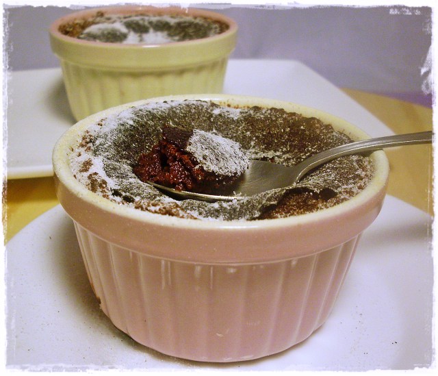 Ingredientes para 4 ramequines pequeños (9cm de diametro); 85 gr de chocolate negro 70% de cacao, 2 huevos, 50 gr de azúcar glase (un poco mas para decorar), 3 gr de maizena, 3 gr de cacao en polvo sin azúcar, 100 ml de nata liquida y mantequilla para el molde.