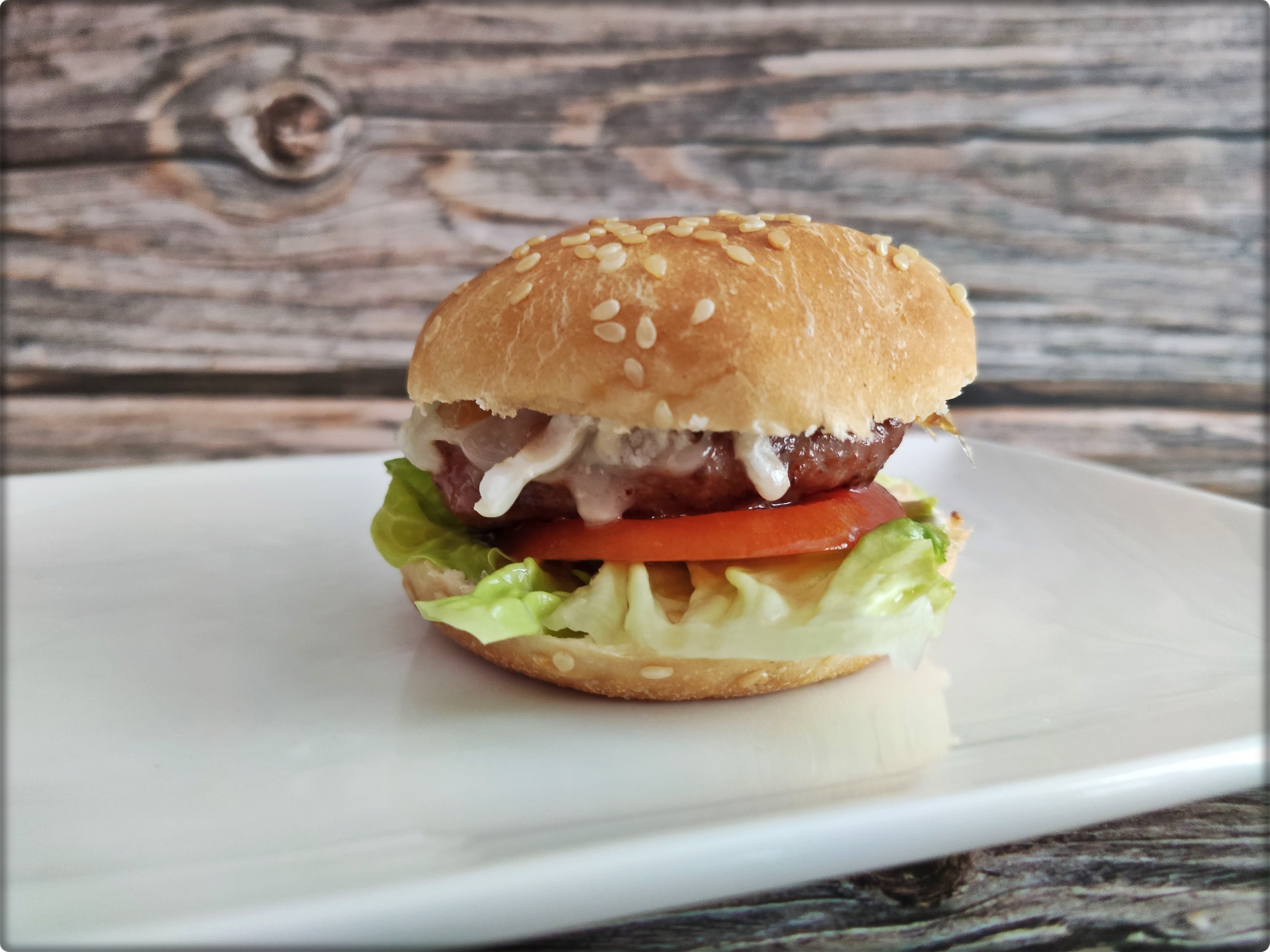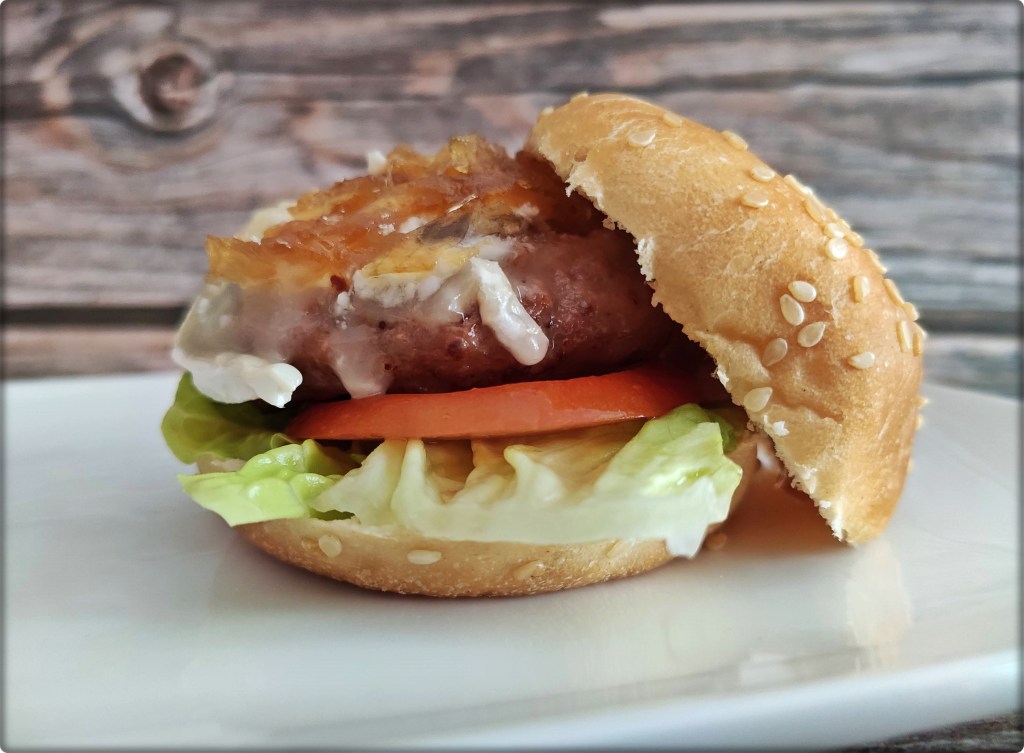 La receta es sencilla, una carne aliñada a mi gusto, ali-oli, lechuga, tomate y una de mis combinaciones favoritas, queso de cabra y cebolla caramelizada. Un bocado perfecto.