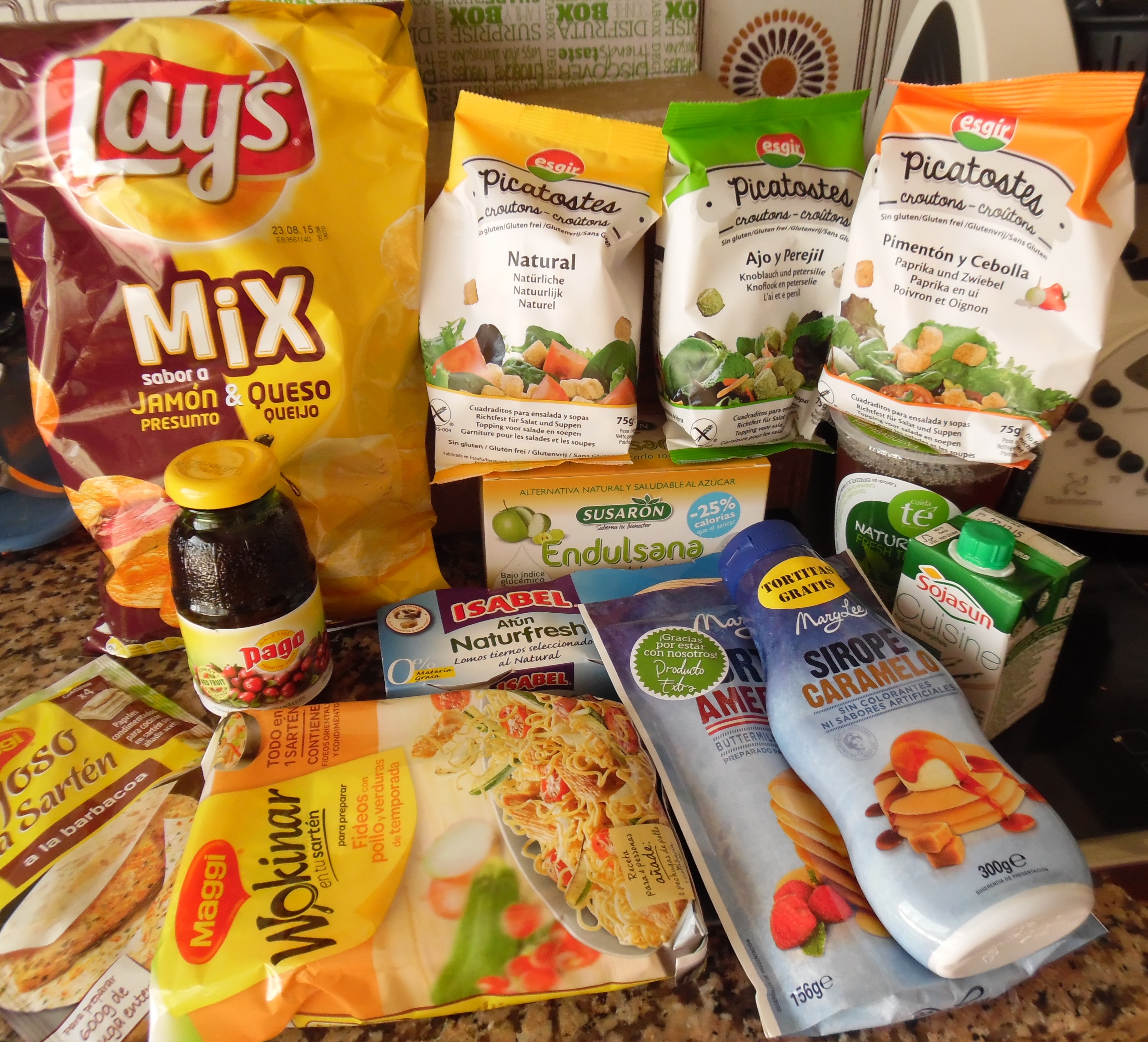 Junio, es la caja con la que abro la entrada, es una caja que me encantó. Las patatas, los productos Maggi son cosas que suelo comprar y que siempre te apetecen en plan capricho, en concreto el wokinar es para añadir verduras y carnes así que aunque es menos instantáneo que los que compramos habitualmente, si que está mas rico. El sirope de caramelo está de muerte, muy rico y venía con un preparado para tortitas que está genial. Por otra parte la nata vegetal y el té no me gustaron nada de nada y el endulzana ni siquiera lo he abierto, no me da mas por estos edulcorantes. El zumo Pago estaba rico, pero si mas, no creo que vuelva a comprarlo y los dos productos que mas me gustaron fueron los picatostes en sus tres versiones, estaban de vicio, tanto en cremas, como en ensaladas, me encantaron y finalmente no se porqué no sale en la foto, me enviaron un bote de mayonesa ligeresa con yogurt que estaba riquísima, la mejor mayonesa para ensaladas que he probado, le da un toque unido y sin duda volveré a comprarla.