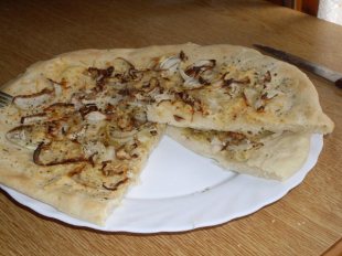 Con ayuda de un rodillo estiramos la mitad de la masa que habiamos preparado y cubrimos con ella un molde que nos sirva para la empanada. Vertimos por encima el relleno de cebolla y sobre él, vamos colocando las parrochas. Finalmente estiramos la otra mitad de la masa y tapamos la empanada.