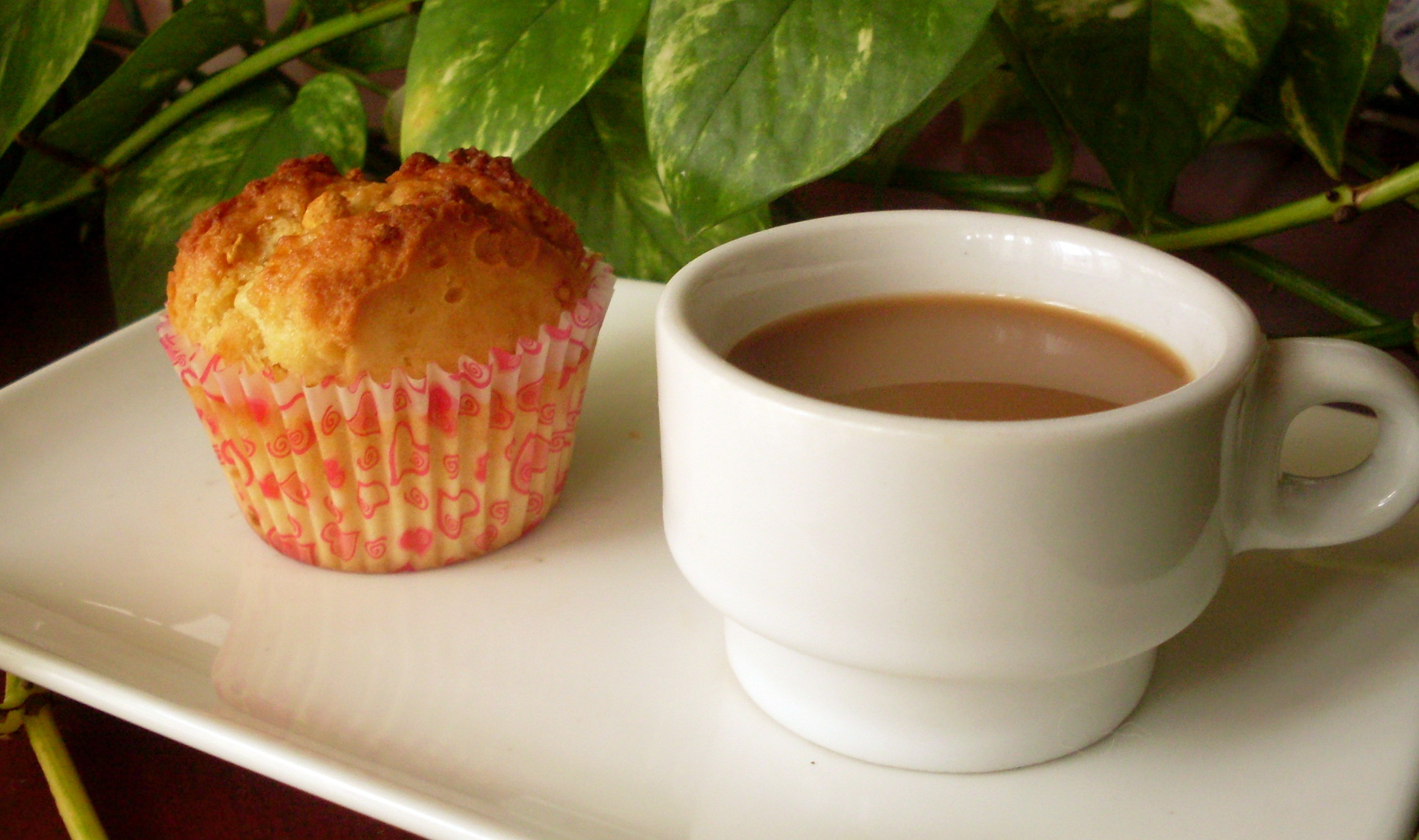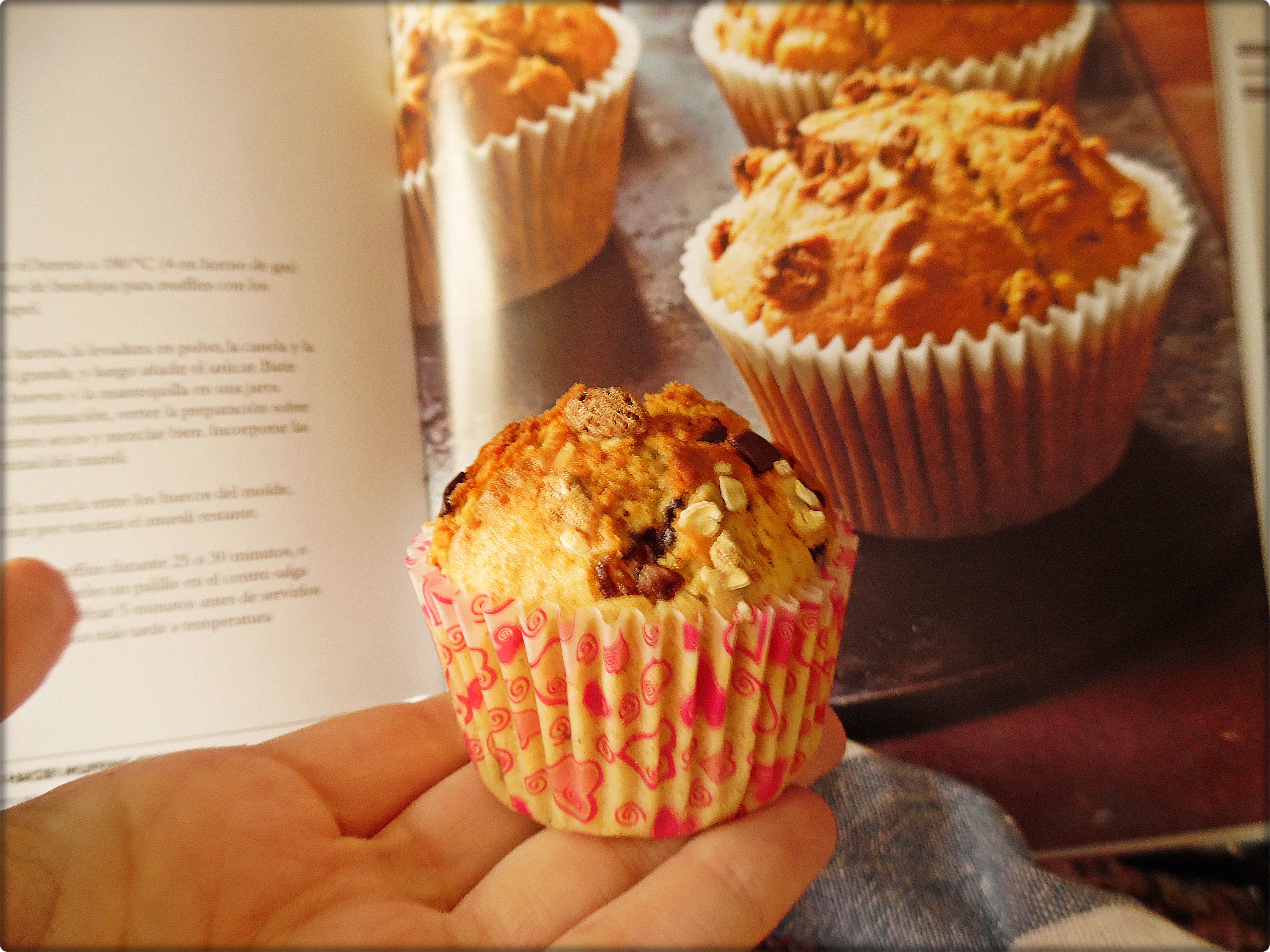 Ingredientes; 300 gr de harina tamizada, 1 cucharadita de levadura en polvo, 1 cucharadita de canela en polvo, 1 pizca de sal, 12 5gr de azúcar moreno, 250 ml de leche entera, 2 huevos, 100 gr de mantequilla derretida, 2 peras picaditas y 100 gr de muesli.
