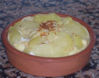Por otro lado mezclamos la nata con el huevo, la salpimentamos (aquí cabría especiarlas mas, yo les pongo de todo porque me gusta la comida muy condimentada, pero en mi casa no gustan mucho las especies y las dejo así) batimos muy bien la mezcla y la ponemos en la cazuela sobre las patatas, luego espolvoreamos con queso rallado (mas que en la foto, es que se me acabó), lo metemos en el horno precalentado a 180º unos 5 min y luego le dejamos el grill hasta que esté gratinado.
