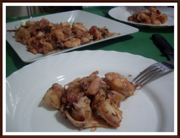 Si veis la foto de la revista, le da mil vueltas a la mía. En ella se diferencia perfectamente los langostinos, el pulpo, se ve salsita…. Pero no se como se han arreglado para que salga con ese aspecto. A mi me ha salido tal cual veis, todo mezclado, todo con el mismo color y el aceite bien integrado en todos los ingredientes. Eso si, aunque no me quedara una foto de libro…. el sabor es otra cosa, me parece un plato riquísimo. Y además se hace super rápido si dejamos el pulpo cocido con antelación o lo compramos ya así.