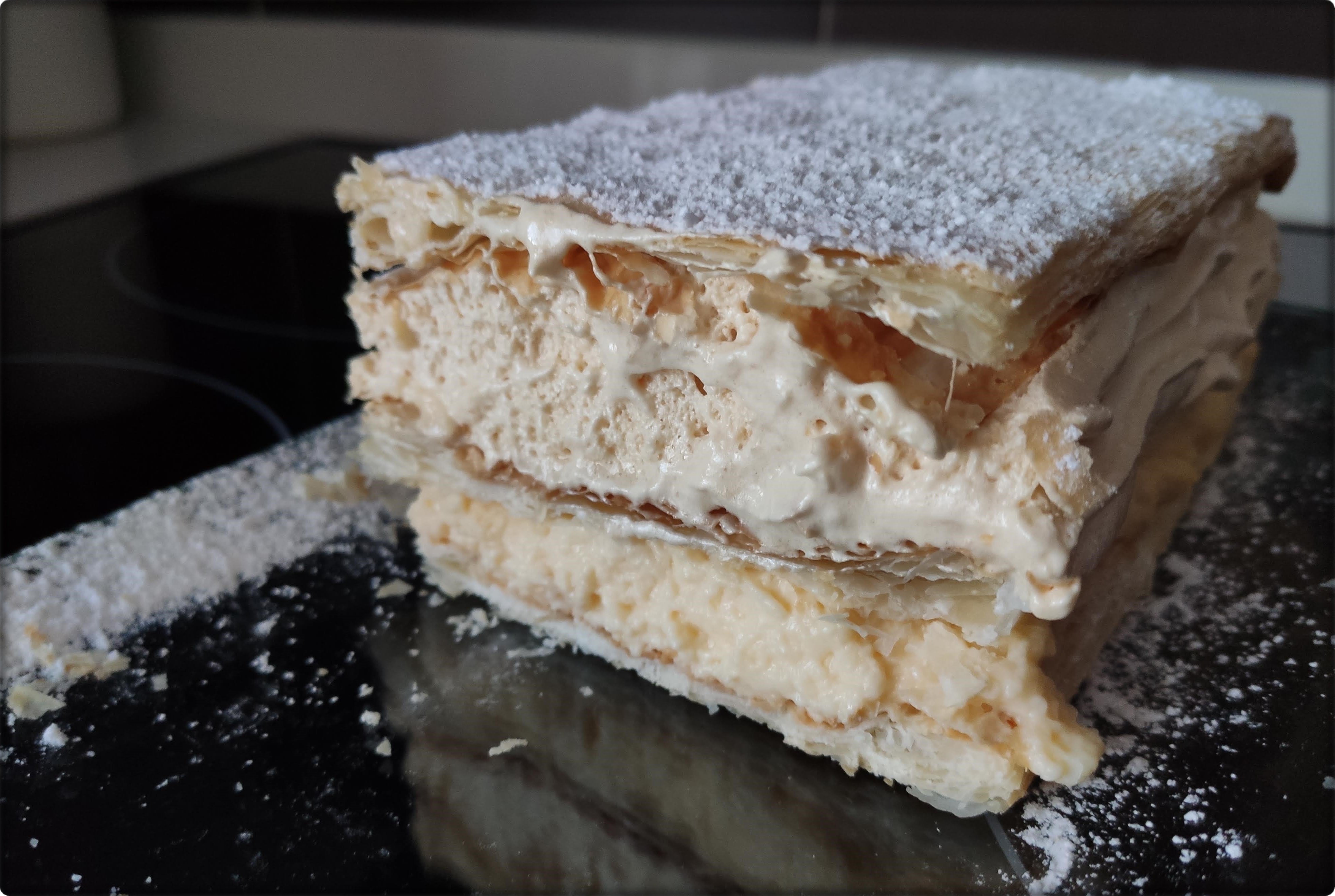Y ahora ya solo tenemos que montar el milhojas. Una capa de hojaldre, una capa de crema, otra de hojaldre, merengue, de nuevo hojaldre y terminamos cubriendo con azúcar glass.