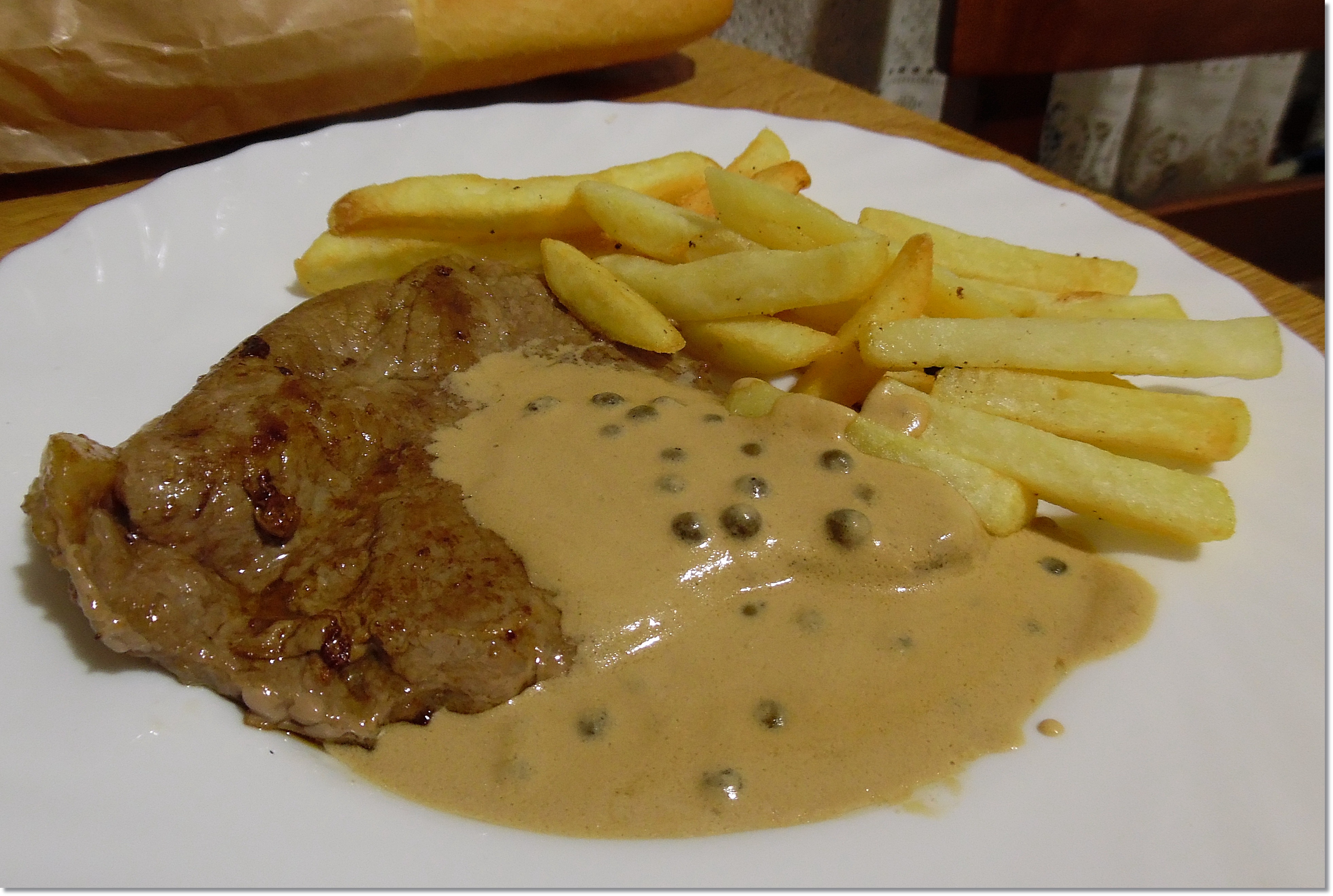 Ingredientes; 1 cucharada de pimienta verde, 1 nuez de mantequilla, 1 copita de coñac, 1 cucharadita de extracto de buey (Bovril), 200 ml de nata liquida, sal y pimienta blanca.